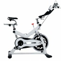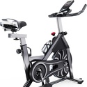 Вертикальный механический спин-байк с ременным типом привода и колодочной системой нагружения. Изменение нагрузки с помощью удобной рукоятки на корпусе тренажера. Предусмотрен экстренный тормоз. Спортивное сидение регулируется в вертикальной и горизонтальной плоскости, и позволяют подобрать удобную посадку для тренировки. Питание компьютера от батареек (тип ААА, 2 шт). На раме установлен держатель для бутылки. Для перемещения тренажера в помещении установлены колеса.